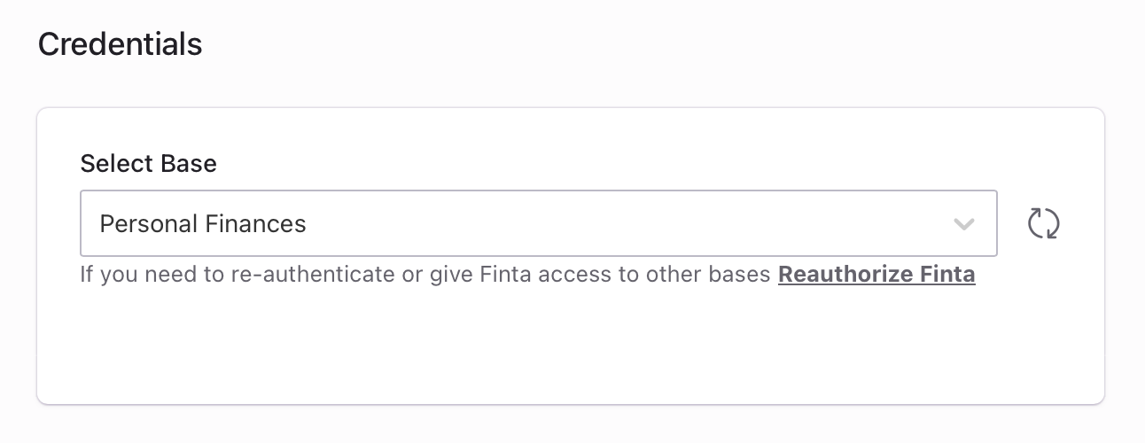 Everytime you connect or re-connect your Airtable account, you’ll need to select all of the bases you want Finta to have access to. If you don’t select either of the “All current and future bases” options, Finta will not be able to access any bases not explicitly selected.