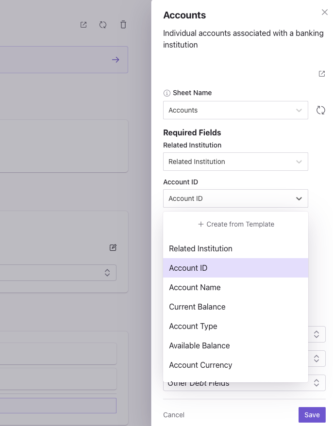 If you want to add a new field, click on Create from Template within the field’s dropdown. Finta will create that field in your destination with the appropriate type automatically