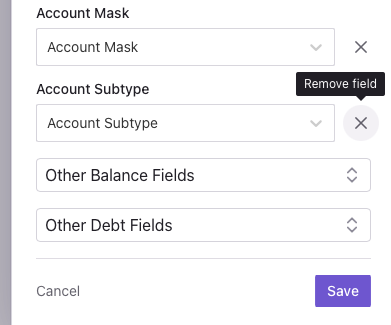 To stop syncing a particular dataset to your destination, simply delete the table configuration by clicking on the trash can icon. Doing so won’t delete any of the data in your destination. Rather, Finta will no longer sync data to that table in any future syncs.The Bank Connections and Accounts tables are required for all destinations.